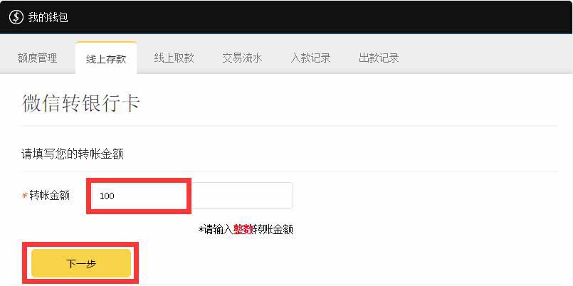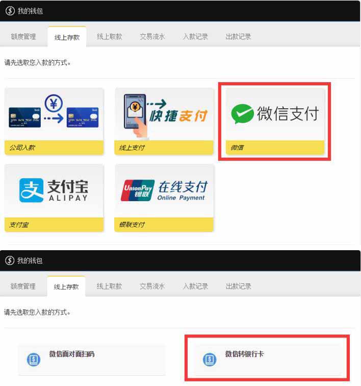 电脑用户点击右上角登入,登入会员账号,点击屏幕右上方的线上存款。再点击微信,选择微信转银行卡