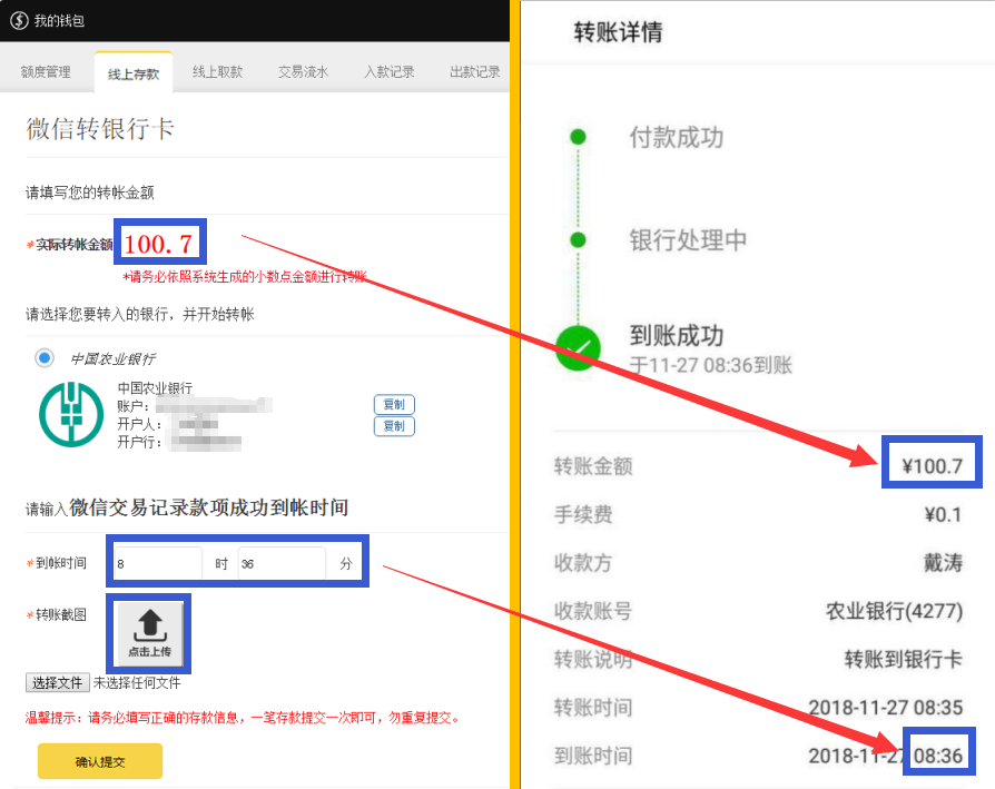 查看系统生成带有小数点的金额,记录好公司收款银行账户,使用微信进行转账(转账金额务必与带有小数点的金额一致);到账成功后按照提示填写到账时间,并上传您的转账详情截图,在点击确认提交(温馨提示:使用微信转账至平安银行是即时到账的; 务必先确认到账后,填写准确到账时间,再点击提交,否则财务人员查询不到款项无法第一时间帮您添加额度。)
